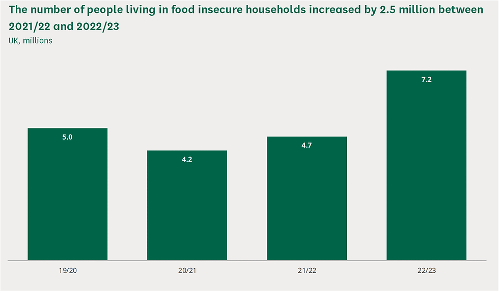 1. Magnitude of Food Insecurity: The number of people in 'food insecure' households increased to 7.2 million in 2022/23, marking a significant rise of 2.5 million people since 2021/22. This represents an increase from 7% to 11% of the population experiencing food insecurity.